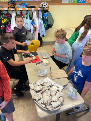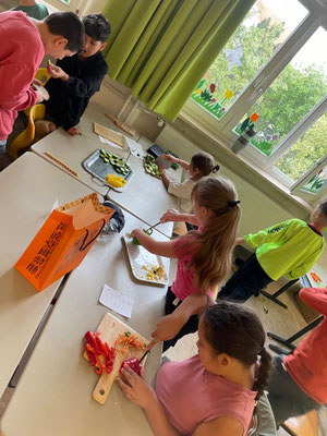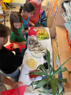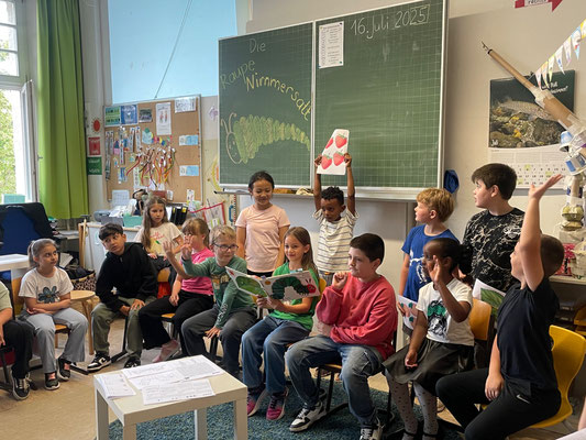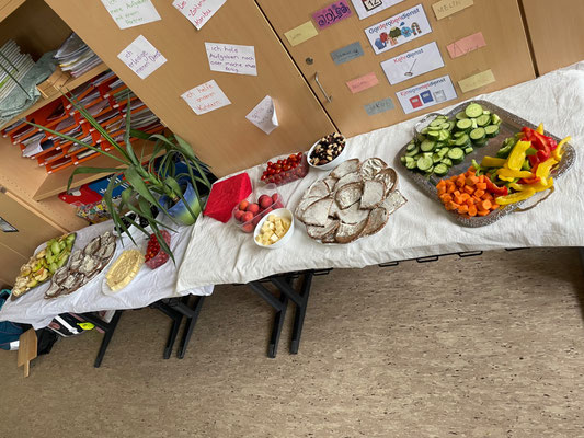 Heute war eine Kiga-Gruppe zum Schnuppern da. Die Klasse 2e hat des Kindern das Buch von der kleinen Raupe Nimmersatt vorgelesen, danach haben alle zusammen ein kleines Begleitheft bearbeitet und anschließend gab es ein von der Klasse hergerichtetes gesundes Frühstücksbuffet.